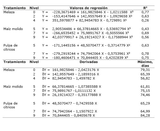 Table 8. Regression equations for predicting the amount of effluent produced and the partial derivatives to estimate the maximum number of days of production during the fermentation of kikuyo grass treated at levels of 0, 2 and 4% molasses and 5, 7, and 9% corn, and citrus pulp added on dry basis, and the corresponding determination coefficient. Cartago, Costa Rica. 2010.