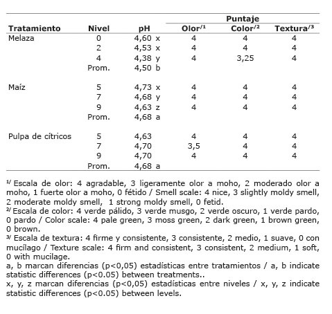 El valor de pH medio general del ensilado fue de 4,62, mostrando diferencias estadísticas (p<0,05) entre aditivos, dentro de un rango muy estrecho (4,38 a 4,73) de poca importancia para la estabilidad de los materiales resultantes, entre todos los tratamientos probados. Similares variaciones estadísticas significativas (p<0,05) se presentaron entre los niveles de cada tratamiento, de poca magnitud real para afectar las buenas características de conservación mostradas. En cuanto a las propiedades organolépticas (Cuadro 9), la adición de melaza y de maíz molido le dio un olor agradable al ensilado en todos los niveles empleados, apreciándose la misma característica con la adición de pulpa de cítricos, con un ligero crecimiento de hongos en el nivel de 7%. En cuanto al color, en general se observó un color verde pálido en todos los tratamientos, excepto uno ligeramente musgoso en el nivel de 4% melaza. Al evaluar la textura, todos los tratamientos, sin excepción, mostraron un tejido firme y consistente propio de un buen proceso de fermentación.