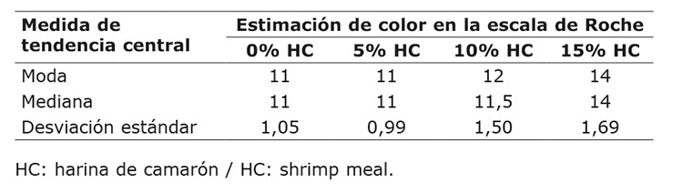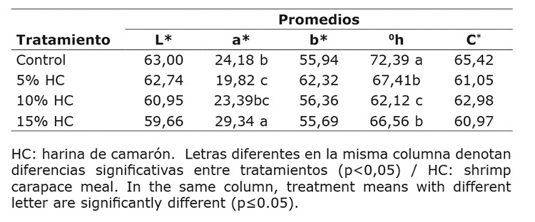 En términos de la variable cromática a*, sí se dieron diferencias significativas (p<0,05), mostrando que conforme aumentó el nivel de inclusión de harina de cefalotórax de camarón, aumentó la tendencia hacia un desplazamiento colorimétrico a las tonalidades rojizas, las que en combinación con el color amarillo basal predominante, generan combinaciones tendientes a tonos anaranjados. El nivel de inclusión de 15% generó una mayor pigmentación de tonalidad anaranjada con respecto a los demás tratamientos. Resultados similares, encontraron Anderson et al. (2008), al estudiar el efecto pigmentante de harina de cangrejo frente al de pigmentos artificiales. Con base en el valor a* para la formulación al 5% de HC, podría creerse que hubo una inconsistencia (Cuadro 4), pues este valor fue significativamente menor al control (p<0,05). Sin embargo, esto derivó de la formulación de la harina estandarizada base que se empleó como control, debido a que esta incluyó en su formulación 0,002% del colorante artificial Lucatin rojo de uso industrial para efectos comparativos, mientras que en los tratamientos experimentales este colorante se eliminó, siendo la fuente de color exclusiva la astaxantina propia de la harina de cefalotórax de camarón.