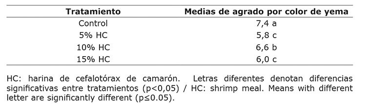 Al evaluar los datos del panel sensorial de agrado por el color de la yema, se evidenciaron diferencias significativas (p<0,05) entre tratamientos (Cuadro 5).
