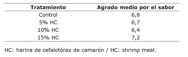 Las medias del agrado por el sabor (Cuadro 6) no mostraron diferencias significativas entre tratamientos (p>0,05), de manera que resultaron muy cercanos entre sí, lo que concuerda con lo reportado por Carranco et al. (2011b). Esto permitiría especular que no existieron sabores percibidos como inapropiados derivados de la dieta de las aves. El tratamiento 15% HC mostró una leve tendencia a un mayor agrado. Todas las muestras presentaron medias cuyos valores fueron superiores a 5,0 por lo que ningún tratamiento se asocia con el rechazo.