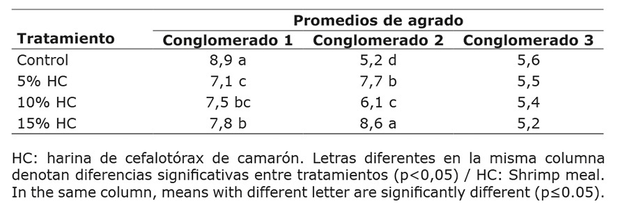 Al no establecerse algún efecto significativo (p>0,05) de la inclusión de la harina de cefalotórax de camarón con el agrado por el sabor del huevo, se realizó un análisis de conglomerados con el método de aglomeración de Ward (De la Fuente, 2011). El mismo permitió agrupar a los 101 participantes del panel en tres diferentes conglomerados: conglomerado uno (40%), el conglomerado 2 (27%), y, finalmente, el conglomerado 3 (33%). Cada conglomerado se analizó a lo interno por medio de ANDEVAS (Cuadro 7).