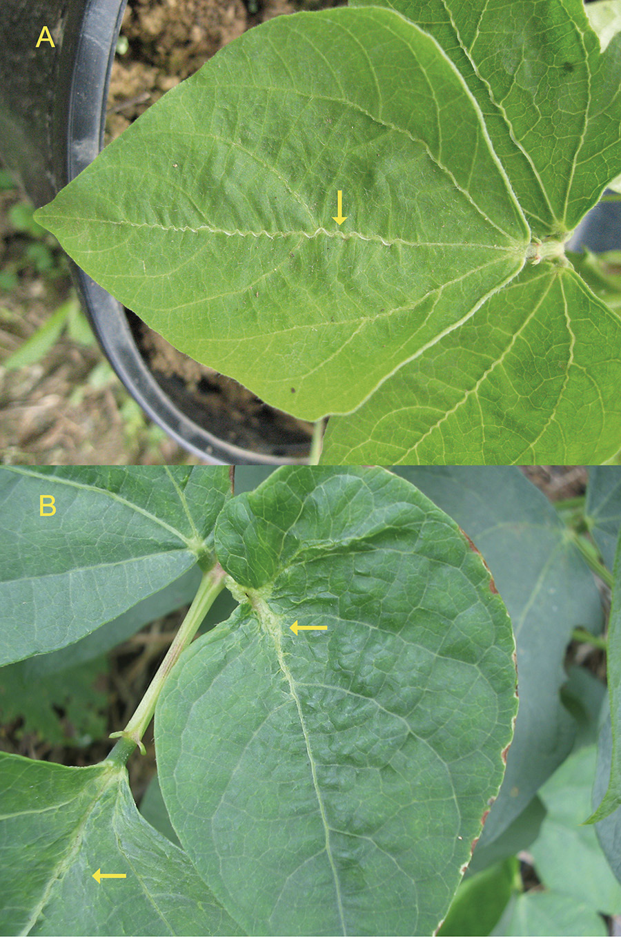 De las 643 semillas recolectadas de plantas con síntomas característicos de amachamiento, germinaron igual cantidad de plántulas, que se desarrollaron normalmente y sin síntomas de la enfermedad. Doce plantas (1,86%) presentaron una deformación muy leve en las venas de los foliolos de la primera hoja trifoliada (Figura 1A), no obstante, continuaron su desarrollo de forma normal y las siguientes hojas trifoliadas brotaron sin ningún tipo de síntoma. La leve deformación que se presentó en la primera hoja trifoliada de algunas plantas pudo deberse probablemente a algún daño mecánico durante el proceso de germinación de la semilla y emergencia de la plántula, ya que no corresponde a la deformación de la vena central y de la lámina foliar características en plantas afectadas por amachamiento (Chaves, 2011; Chaves et al., 2013) (Figura 1B). Por otro lado, en ninguna de las plantas estudiadas se presentaron lesiones necróticas en las hojas cotiledonales ni en la primera trifoliada, que es uno de los síntomas iniciales del amachamiento (Chaves et al., 2013). Además, todas las plantas produjeron flores y vainas, lo que contrasta con los síntomas típicos de la enfermedad: aborto floral y producción de muy pocas vainas o su ausencia total (Chaves y Araya, 2012b; Chaves et al., 2013). La ausencia de los síntomas que pueden ser causados por A. besseyi y el desarrollo normal de todas las plantas evaluadas, indica que no hubo transmisión del nematodo a través de semilla proveniente de plantas con amachamiento.