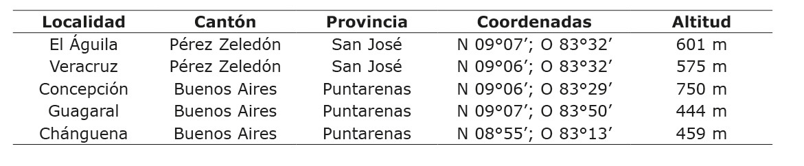 Como respaldo a lo observado en la casa de mallas, en enero del 2015 se realizó una prueba de laboratorio en la Estación Experimental Agrícola Fabio Baudrit Moreno de la Universidad de Costa Rica, situada en San José de Alajuela (N 10° 01’; O 84°16’; 840 msnm), para determinar la presencia de especímenes en semillas de frijol. Para ello, durante el 2014 se recolectaron semillas de plantas de la variedad Cabécar con síntomas característicos de la enfermedad en plantaciones comerciales, ubicadas en cinco localidades de la Región Brunca de Costa Rica (Cuadro 1), segunda en importancia para la producción de frijol del país y donde se presentan las mayores pérdidas en rendimiento por el amachamiento (Chaves y Araya, 2012b).