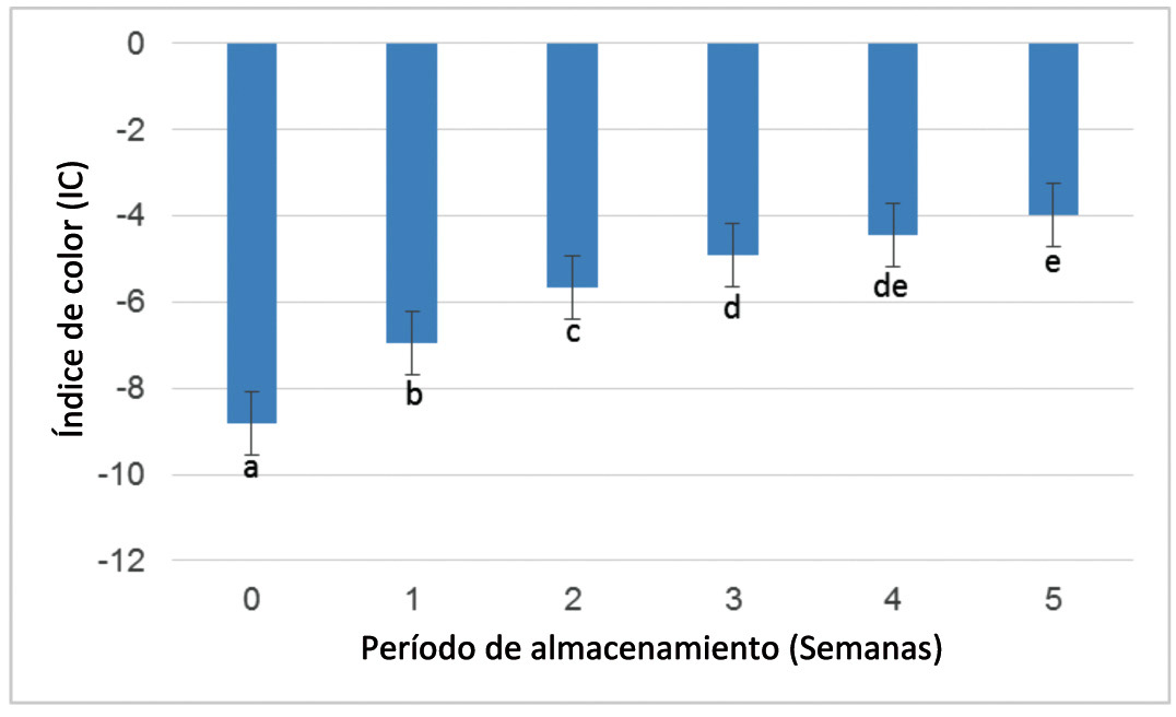 La expresión de color fue modificada por el tiempo de almacenamiento de los frutos, el análisis estadístico definió seis grupos de medias (Figura 9), en el momento de corte los frutos alcanzaron un valor - 8,80, que aumentó moderadamente en la primera y segunda semana para obtener valores de -6,94 y -5,67, respectivamente; asimismo se incrementó de forma paulatina entre las semanas tres y cinco para alcanzar el valor final de -3,97. Lo que indica que el color de estos frutos cambió de verde profundo a verde amarillento como resultado de la degradación de la clorofila y síntesis de compuestos carotenoides (López-Camelo y Gómez, 2004; Vignoni et al., 2006). Resultados similares de índice de color para jitomate (Lycopersicon esculentum Mill) fueron divulgados por López-Camelo y Gómez (2004), quienes encontraron una correlación directa entre esta expresión y el grado de maduración, con valores de IC de -14,6 para frutos verde maduros y de 21,8 para frutos en madurez de consumo.