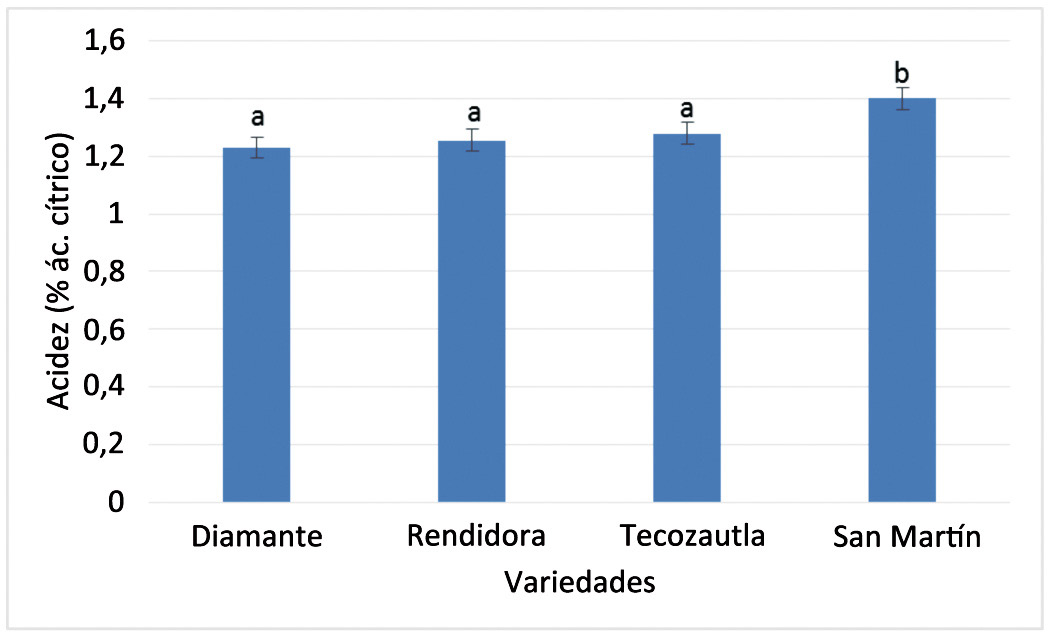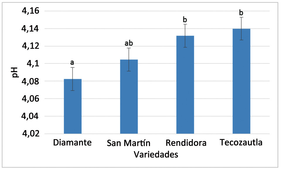 En este estudio se encontraron diferencias significativas (p≤0,05) para el pH entre las variedades, diferenciando a Diamante como la más ácida, con pH de 4,08, seguida por la San Martín con 4,10 y finalmente las variedades Rendidora y Tecozautla 04, formando el mismo grupo con valor de 4,13. Los datos de pH reportados se encuentran dentro del rango (3,93 - 4,23) obtenido para cinco poblaciones autotetraploides y cuatro diploides por Ramírez-Godina et al. (2013), cuyo análisis estadístico presentó diferencias significativas entre las poblaciones (Figura 16).