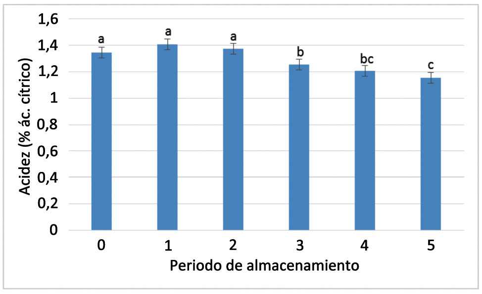 El contenido de acidez de los frutos fue modificado por el periodo de almacenamiento, y de acuerdo con el análisis de varianza, se encontró que este parámetro varió ligeramente del momento de corte hasta el final de las primeras dos semanas, alcanzando un promedio de 1,37% de ácido cítrico. En este periodo su caída no fue significativa, pero posteriormente los valores descendieron hasta 1,26, 1,20 y 1,16% de ácido cítrico (Figura 11); este cambio puede ser explicado por la síntesis de ácidos orgánicos en la primera semana y el bajo consumo de ácidos, debido a una tasa respiratoria también baja para este fruto (Peiris et al., 1997).