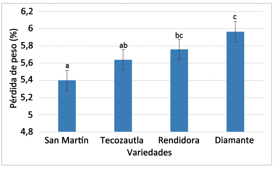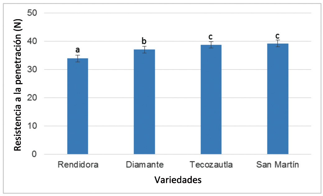 El análisis estadístico aplicado a los valores encontrados de resistencia a la penetración para las variedades estudiadas, mostraron diferencias significativas (p≤0,05) entre variedades. La variedad Rendidora se presentó con la menor resistencia, con un valor de 33,9 N, seguida por Diamante con 37,0 N; mientras que San Martín y Tecozautla 04 fueron las más resistentes al manejo poscosecha con valores similares de 39,0 N (Figura 18).