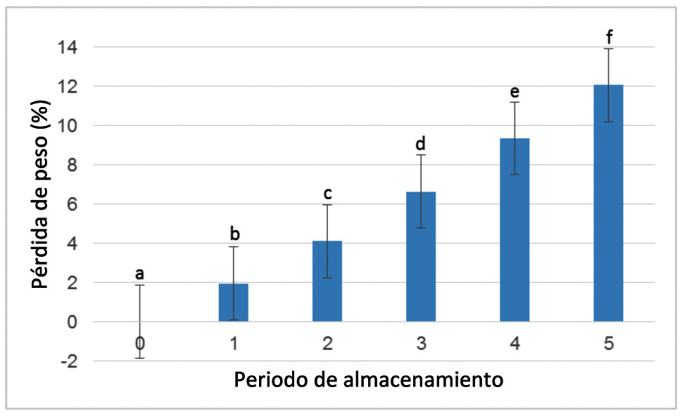 La determinación del peso de los frutos se realizó con una balanza analítica. La pérdida de peso se calculó por la diferencia entre el primer y segundo valor multiplicado por 100 y dividido entre el peso inicial.
