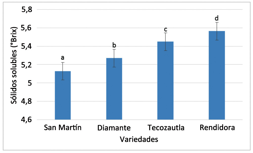 En este estudio, la cantidad de sólidos solubles (°Brix) registró diferencias significativas entre las variedades (Figura 14), obteniéndose el valor más bajo para la variedad San Martín con 5,1, seguida por las variedades Diamante, Tecozautla 04 y Rendidora con valores de 5,27, 5,4 y 5,5, respectivamente. Los datos reportados son afines a los encontrados en cinco poblaciones autotetraploides y cuatro diploides por Ramírez-Godina et al. (2013), quienes indicaron un rango de 5,95 a 6,63 °Brix, con diferencias significativas entre las poblaciones.