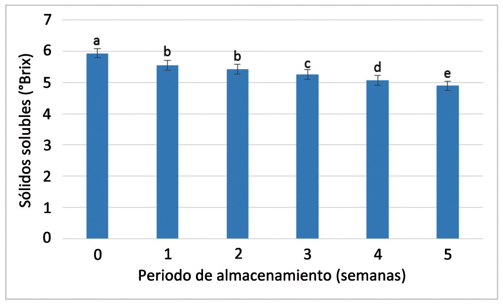 La cantidad de sólidos solubles en el tomate de cáscara fue modificada por el tiempo de almacenamiento, de acuerdo con la comparación de medias, los valores siguieron una pérdida paulatina desde el momento de corte hasta la quinta semana de almacén, con valores de 5,9 a 4,8 °Brix (Figura 15). Este comportamiento es justificado por la escasa oxidación de azúcares y ácidos consumidos, debido a la baja tasa respiratoria de este fruto (Peiris et al., 1997). Los resultados fueron congruentes con la variabilidad natural de la especie y cercanos a los reportados para la variedad “CHF1- Chapingo”, la cual tiene valores entre 6,1 y 5,25 que corresponden al momento de corte y después de veinticinco días de almacenamiento a 20 °C (Cruz-Álvarez et al., 2012).