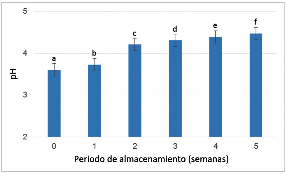 Al igual que otras características, el pH fue modificado durante el periodo de almacenamiento (Figura 17). El análisis estadístico mostró diferencias significativas entre las diferentes fechas de almacén, el valor inicial en el momento de corte fue de 3,60, el cual se incrementó gradualmente para alcanzar el valor de 4,46 en la quinta semana de almacenamiento. Este comportamiento puede explicarse por la síntesis y acumulación de ácidos orgánicos hasta el momento de corte y su pérdida debida a la respiración, durante la maduración.