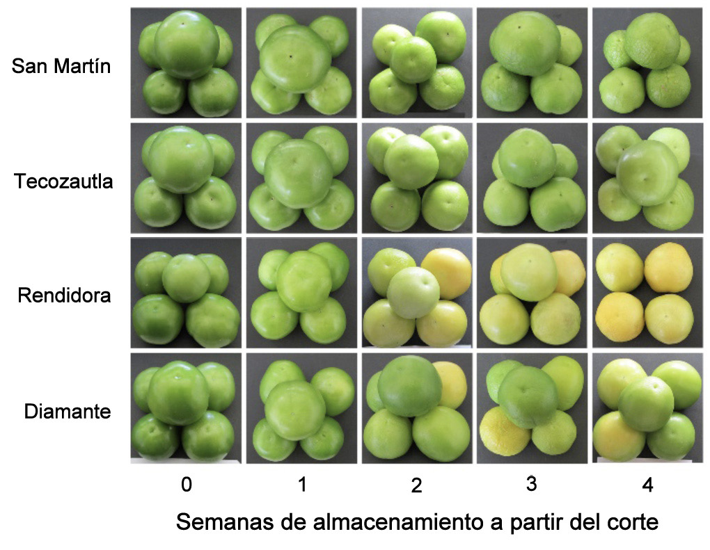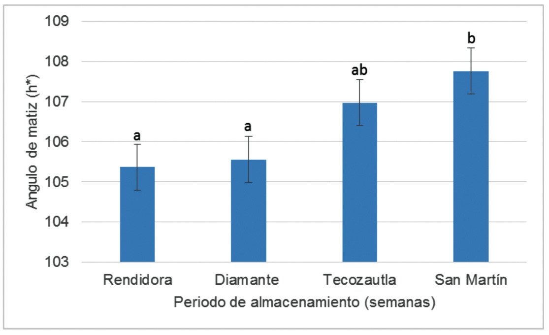 El análisis estadístico de los valores de color expresado como ángulo de matiz (h*), mostró diferencias significativas entre variedades, los datos de esta coordenada cilíndrica mostraron un valor alto para la variedad San Martín (107,7), seguida por Tecozautla 04 (106,9) y al final por las variedades Diamante y Rendidora con un promedio de 105,4; estos valores siguieron una tendencia similar al valor de C* (Figura 6), lo cual indica que los colores de estos frutos cambian gradualmente de verde a amarillo, dependiendo de la variedad (Figura 1).