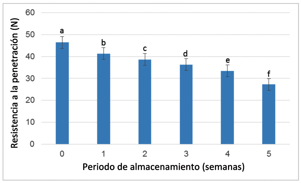 La pérdida de resistencia a la penetración se realizó mediante un medidor de textura, modelo TA-TX2i con una sonda de 0,5 cm de diámetro en dos puntos extremos del eje ecuatorial de cada fruto y los resultados se expresaron en Newtons (N).