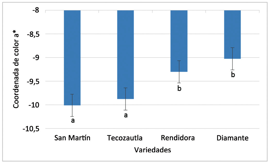 El análisis estadístico de este parámetro, bajo las condiciones del estudio, mostró diferencias significativas (p≤0,05) entre variedades, indicando que las variedades San Martín y Tecozautla 04 tendieron a desarrollar y mantener mayor color verde (a*= 9,94), mientras que las variedades Rendidora y Diamante (a* = 9,15), tendieron a perder el color verde (clorofila) (Figuras 1 y 2). Estos resultados pudieron deberse a los diferentes tiempos de degradación de la clorofila en cada variedad, por su contenido y actividad de clorofilasas y la presencia de otras enzimas degradantes, o a la facilidad de degeneración de las estructuras cloroplástidas (Hornero-Méndez y Mínguez-Mosquera, 2002).