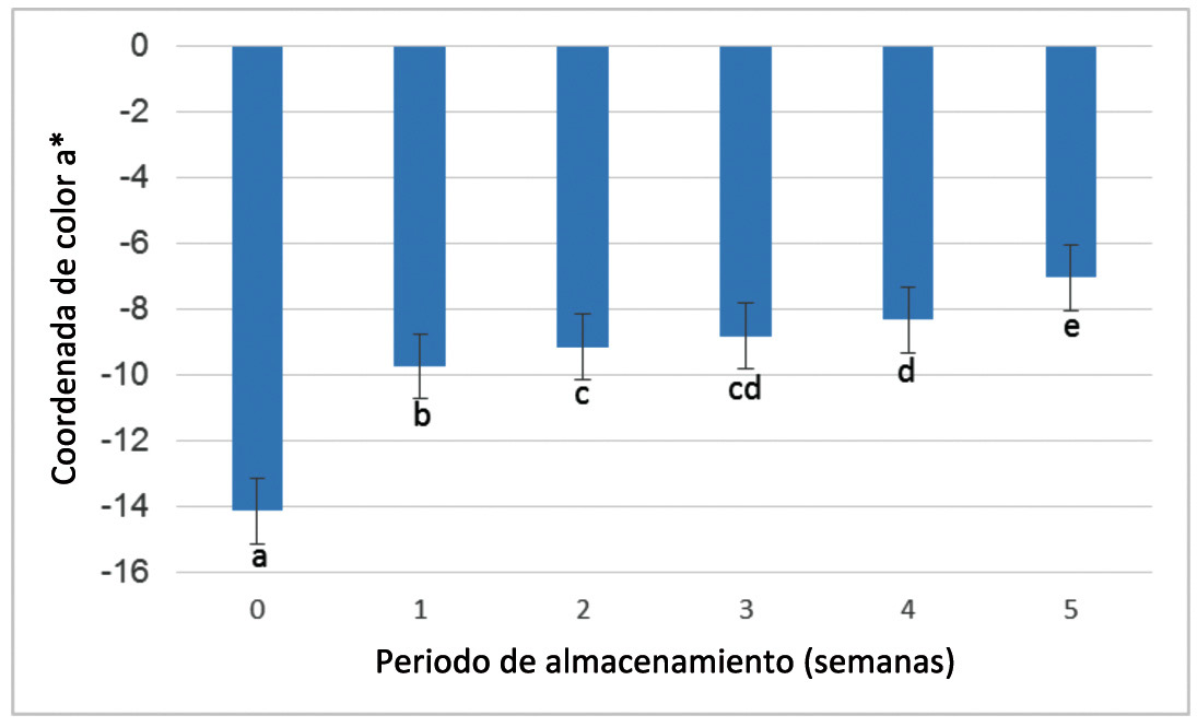 El periodo de almacenamiento modificó los valores de la coordenada a*, el análisis estadístico mostró diferencias significativas (p≤0,05) entre las diferentes fechas de muestreo (Figura 3). Se observó que los valores de a* se redujeron a medida que avanzó el periodo de almacenamiento pasando de un valor de -14,1, para el momento de corte, hasta alcanzar el valor de -7,0 en la quinta semana de almacenamiento. Este comportamiento fue similar al reportado para el fruto de Physalis peruviana L., en el cual el cambio de color permitió determinar seis etapas de maduración, que representan matices de color verde en el momento de corte, a tonos de naranja-rojo en su estado de madurez de consumo (Fischer y Martínez, 1999). De igual manera se han indicado tendencias con correlaciones positivas, entre el parámetro a* y las diversas etapas de maduración en banana (Soltani et al., 2011) y mango “Keitt” (Padda et al., 2011). Lo anterior se explica por el catabolismo de la clorofila, debido a la acción de clorofilasas y la aparición de otros pigmentos como carotenoides (Hornero-Méndez y Mínguez-Mosquera, 2002).