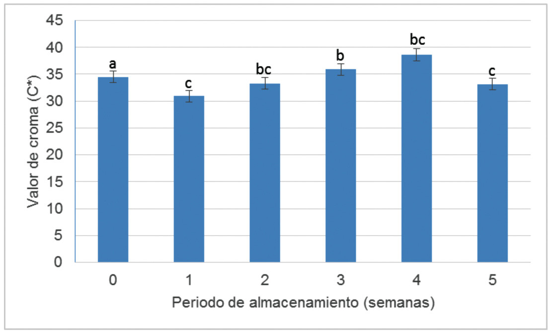 El comportamiento de la coordenada C* fue afectado por el periodo de almacenamiento de forma moderada (Figura 5), el análisis estadístico mostró un valor de C* de 34,5 para el momento de corte, el cual se redujo durante las semanas 1, 2 y 5 a valores de 32,4, y aumentó en las semanas 3 y 4 a valores de 35,9 y 38,6, respectivamente. Esta variación se pudo deber a diferentes factores, entre los que se pueden destacar diferencias de color en el momento de corte y la pérdida de clorofila en la semana cinco. Tendencias erráticas similares fueron reportadas para el valor de C* durante la maduración de frutos de banana por Soltani et al. (2011). Para frutos de jitomate, la coordenada C* no es un indicador adecuado de madurez, ya que esencialmente es una expresión de pureza para un color específico y que, en el caso de este fruto, se presentan simultáneamente tanto degradación de clorofila como síntesis de compuestos carotenoides, lo cual aplicaría también para el tomate de cáscara.