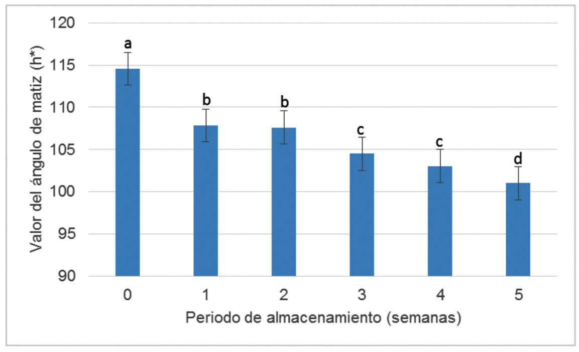La expresión de color presentó un comportamiento inversamente proporcional al período de almacenamiento de los frutos (Figura 7), el análisis estadístico mostró el valor más alto (114,5) para las muestras obtenidas en el momento de corte, seguida por las representantes de la semana 1 y 2 con un promedio de 107,7, después las pertenecientes a las semanas 3 y 4 con un valor de 103,7 y finalmente en las correspondientes a la semana 5 con 101, indicando que el tiempo de almacenamiento del fruto resultó en un cambio gradual de color de verde a amarillo (Figura 1). Resultados similares fueron obtenidos durante el proceso de maduración de jitomate, en el cual, el ángulo de tono presentó una tendencia a declinar, particularmente entre las etapas de maduración I y II (Radzevičius et al., 2008). En este mismo fruto, López-Camelo y Gómez (2004), reportaron valores de h* de 113,3 para frutos verde-maduros (color verde) y de 59,3 para frutos en madurez de consumo (color rojo). De forma similar, Santamaría-Basulto et al. (2009b), reportaron un decremento en el valor de h* con valores de 120 en el momento de corte, a 65 cuando el fruto alcanzó la madurez de consumo.