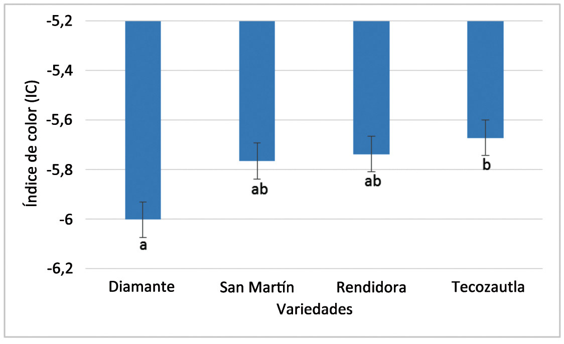 El análisis estadístico de los datos obtenidos para el índice de color, mostró diferencias significativas entre variedades (Figura 8), el valor más bajo (- 6,0) fue para la variedad Diamante, seguida por las variedades San Martín y Rendidora con valores de -5,75 y finalmente Tecozautla 04 con -5,67. Esta tendencia fue similar a la descrita para el parámetro a*; sin embargo, en esta se formaron tres grupos diferentes de medias y en el caso de a* sólo se formaron dos. En general, los datos anteriores indican que los colores de los frutos estudiados fueron los característicos de estas variedades y van del verde profundo al verde amarillento, según la escala del IC (Vignoni et al., 2006).