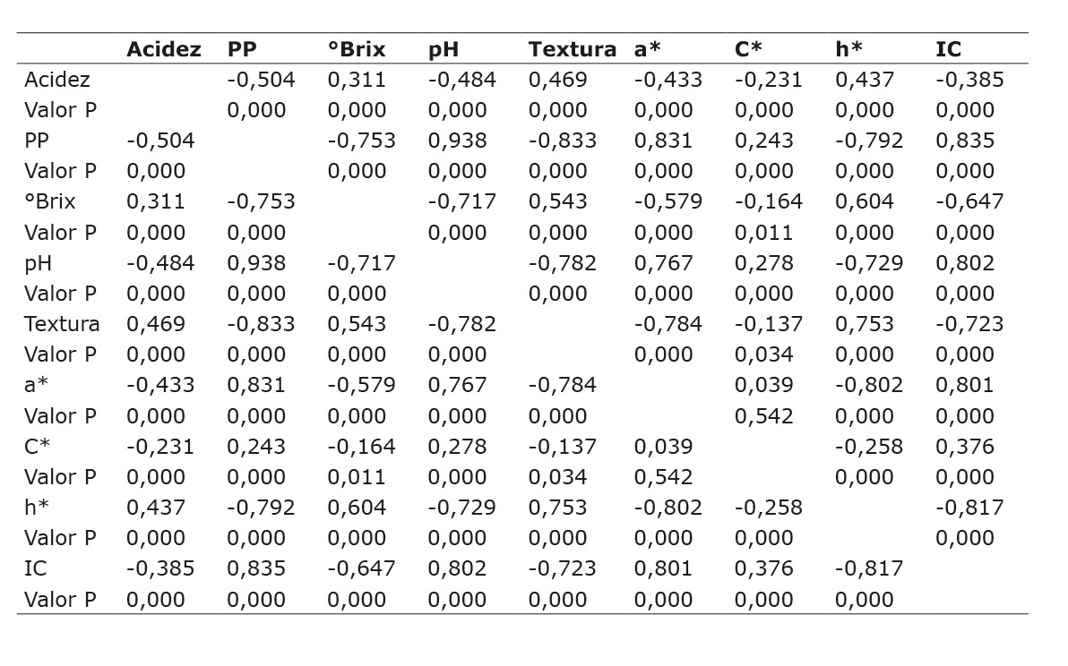 Los coeficientes de correlación entre los diferentes parámetros de color analizados, mostraron similitudes estadísticamente significativas en tres de ellos: a*, h* e IC (Cuadro 1), el valor de C* no presentó analogía con el resto de las expresiones de color. A su vez, de los tres parámetros de color, el parámetro a* mostró el mayor coeficiente de correlación con la resistencia a la penetración del fruto, característica que más se asocia a la calidad del fruto, seguida por el IC y después el valor h*. En el caso de la pérdida de peso, los coeficientes de correlación fueron muy similares para a* e IC y un poco menor con h*. Esta relación se repitió para las variables acidez, sólidos solubles y pH.
