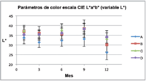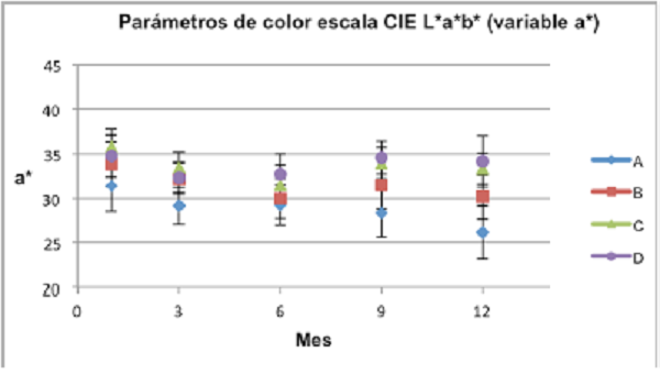 Transcurrido un año de evaluación, los tratamientos C y D no presentaron diferencias estadísticamente significativas, ambos obtuvieron los mayores valores de a*; es decir, que fueron los que presentaron un color rojo más intenso transcurrido un año de almacenamiento. Los tratamientos A y B presentaron diferencias estadísticamente significativas, siendo A el que obtuvo el menor valor para el parámetro a*; es decir, que era el tratamiento con el color más oscuro.