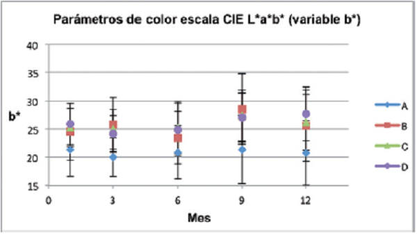 En los tratamientos B, C y D el parámetro b* no presentó diferencias significativas en todo el período de tiempo evaluado.