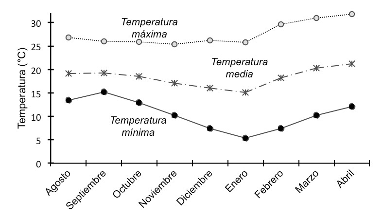 Figure 1. Maximun, average, and minimum temperatures in Madgalena Apasco, Oaxaca. From August 2013 to April 2014 (Source: Network-INIFAP meteorological stations, station: Santo Domingo Barrio Bajo, Villa de Etla).