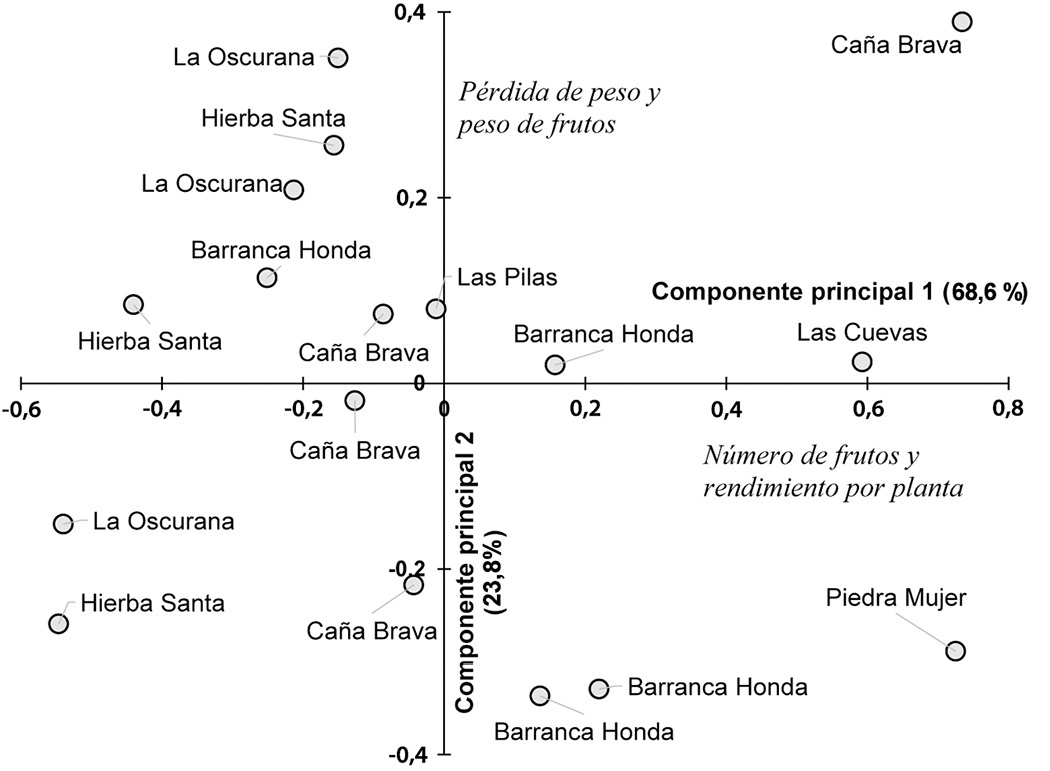 Con el análisis de componentes principales se determinó que la altura de planta a los 120 ddt, diámetro de tallo, ancho de fruto, rendimiento por planta, frutos por planta, peso fresco de frutos, peso seco y pérdida de peso, fueron las variables de mayor valor explicativo de la variación fenotípica de las 31 poblaciones caracterizadas de chile tusta. En los dos primeros componentes principales se explicaron el 92,4% de la varianza total.