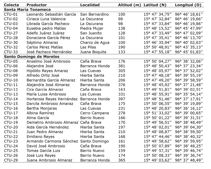 Durante el periodo noviembre 2012 a enero 2013, se realizaron diversos recorridos por las parcelas de agricultores de catorce comunidades de los municipios de Santa María Tonameca y Santo Domingo de Morelos, Oaxaca, donde se colectaron 31 muestras poblacionales de chile tusta (Cuadro 1). Las comunidades se localizan geográficamente de 15° 47’ 32,84’’ a 15° 51’ 33,02’’ LN, y 96° 35’ 54,14’’ a 96° 47’ 2,09’’ LO, su altitud va de 98 a 397 msnm con temperaturas medias anuales de 23,2 a 31,7 °C y precipitación media de 641 mm (INIFAP, 2014). De acuerdo con las facilidades otorgadas por el agricultor, se colectó un mínimo de quince frutos por población, y al momento de la colecta se integró una ficha de datos pasaporte con información de nombre del donante, georeferenciación del sitio de colecta, descripción del fruto y una descripción general del manejo que le da el agricultor al cultivo. Posteriormente, se extrajo la semilla de los frutos maduros y secos.