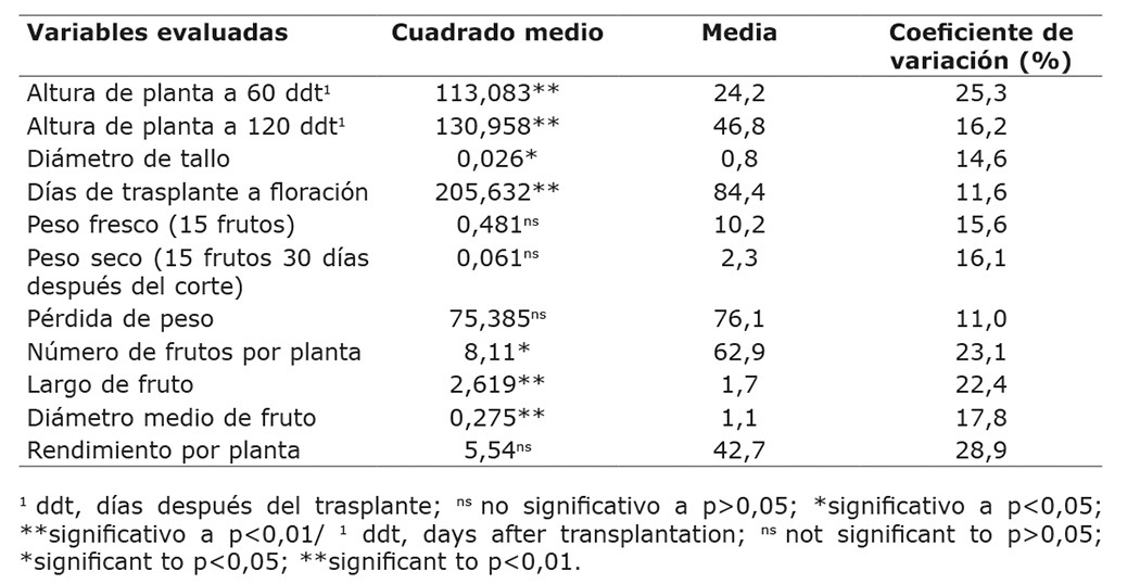 Hubo diferencias significativas (p<0,05) entre accesiones de chile tusta en diámetro del tallo, número de frutos por planta, altura de planta a los 60 y 120 días después del trasplante, días a floración, largo y ancho del fruto (Cuadro 2). La mayor variación entre poblaciones se cuantificó en altura de planta a sesenta días del trasplante, número de frutos por planta, largo y ancho de frutos y rendimiento por planta.