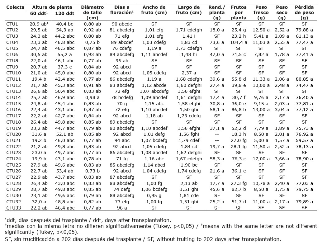 Se evaluaron once caracteres agromorfológicos, con base en los descriptores para Capsicum propuestos por el IPGRI (1995): altura de planta a los 60 y 120 días después del trasplante (ddt), diámetro del tallo, días a floración, y en los frutos, peso y número por planta, largo y ancho, peso promedio al corte y treinta días después del corte, y porcentaje de pérdida de peso después de treinta días de almacenamiento a temperatura ambiente.