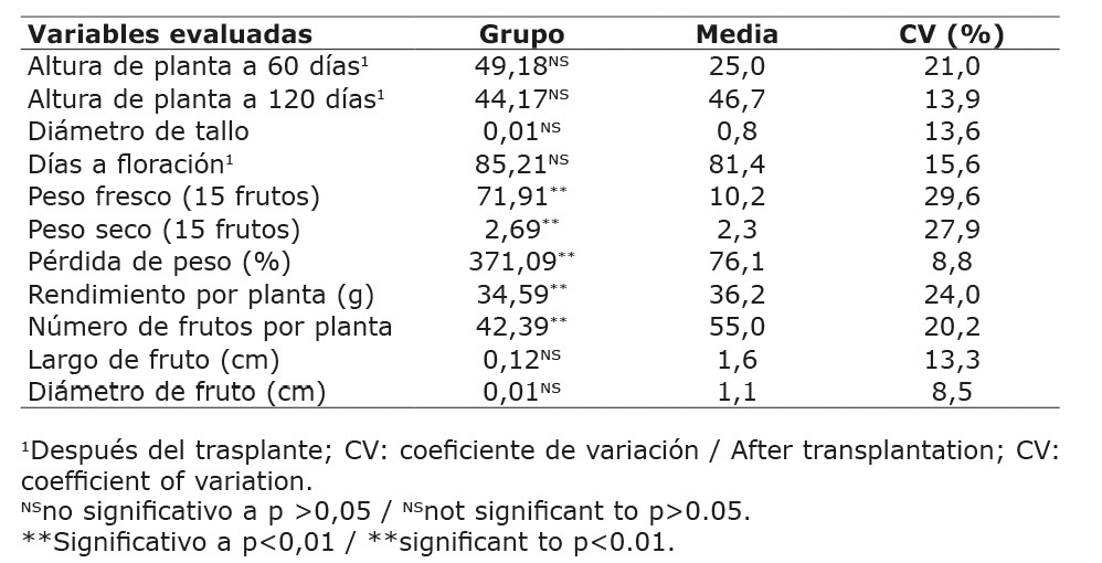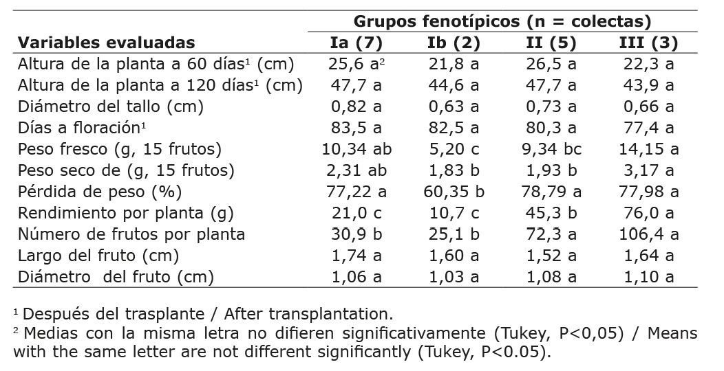 Respecto a la variación fenotípica entre grupos, el grupo I presentó las plantas más tardías (83,5 días) a la floración después del trasplante y la diferencia entre subgrupos fue en diámetro de tallo. En el grupo II se presentaron las plantas más altas (47,7 cm), la mayor pérdida de peso (78,78%) y los frutos más pequeños (1,52 cm de largo), en contraste con el grupo III que presentó plantas pequeñas (43,9 cm), frutos de mayor diámetro (1,10 cm), y los mayores rendimientos por planta (76 g). Además, el mayor número de frutos se determinó en el grupo III, 107 frutos. En contraposición, el grupo I manifestó la menor pérdida de peso 60,35% y rendimientos bajos con 10,7 g por planta (Cuadro 5).