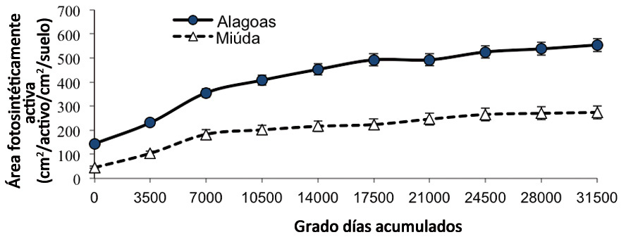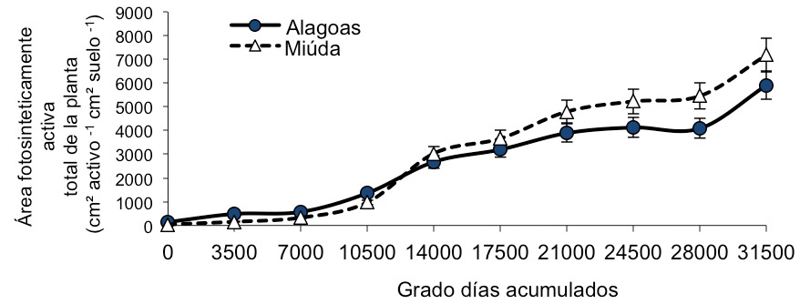 Las superficies fotosintéticas activas encontradas en los cladodios de los cultivares Alagoas y Miúda se muestran en la Figura 6. Según Garcia de Cortazar et al. (2001) valores superiores a 400 cm2/activo/cm2/suelo permiten asegurar altas productividades de materia seca para el Nopal. El cultivar Alagoas presentó a los 31 500 GDA, áreas superiores a 500 cm2/activo/cm2/suelo, mientras que el cultivar Miúda no superó los 300 m2/activo/cm2/suelo. Garcia de Cortazar y Nobel (1991) afirman que el comportamiento puede estar en función de las distintas morfologías de los cultivares.
