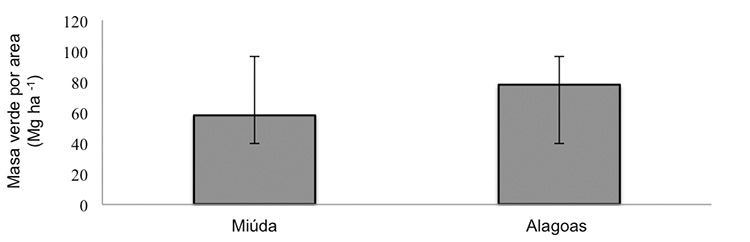 Pasados 1000 días después de la plantación, las plantas fueran cortadas y pesadas para la determinación de acumulación de fitomasa por hectárea. Las medias se compararon por prueba T (de Student) a una significancia de 5%.
