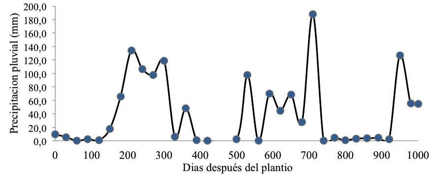 El acumulado de lluvia fue de 1452,4 mm; la mayor intensidad se observó en los meses de febrero a junio de 2005, sumando un total acumulado de 524 mm (Figura 1). El periodo de menor intensidad se registró de agosto a diciembre de 2006, con 16 mm. Hubo una gran variación en la intensidad de lluvias a lo largo del periodo experimental. Para Andrade et al. (2006), esta alta variabilidad de las lluvias estimula mecanismos en el metabolismo y adaptación morfológica del nopal específicos y peculiares de cada especie notoriamente en el metabolismo y adaptación morfológica del nopal.