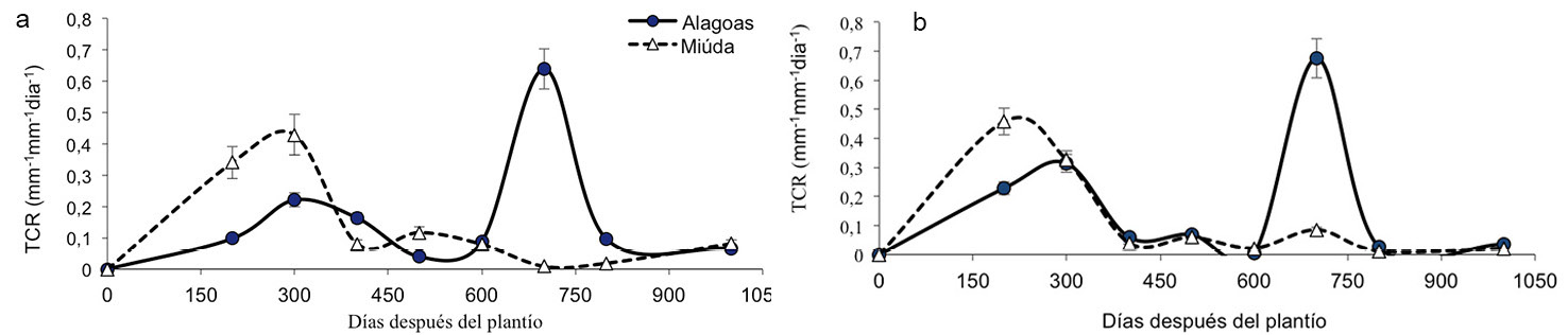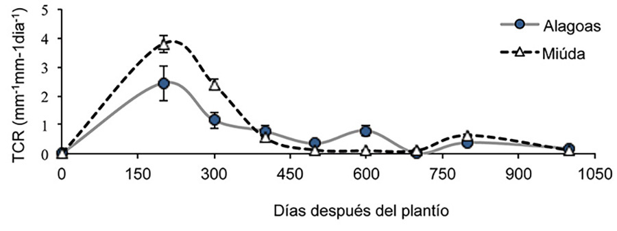 La máxima tasa de crecimiento relativo (TCR)(Figura 2) fue próximo a los 200 días después del plantío, en los meses siguientes se observó una evidente disminución en la velocidad de crecimiento en todos los puntos de evaluación. Al comparar los cultivares no se encontraron diferencias (p>0,05) entre ellos a los 1000 DDP. La TCR máxima de los cultivares, de forma general, ocurre durante el periodo inicial de crecimiento, seguido de una disminución gradual hasta la fase de maduración (Pereira y Machado, 1987).