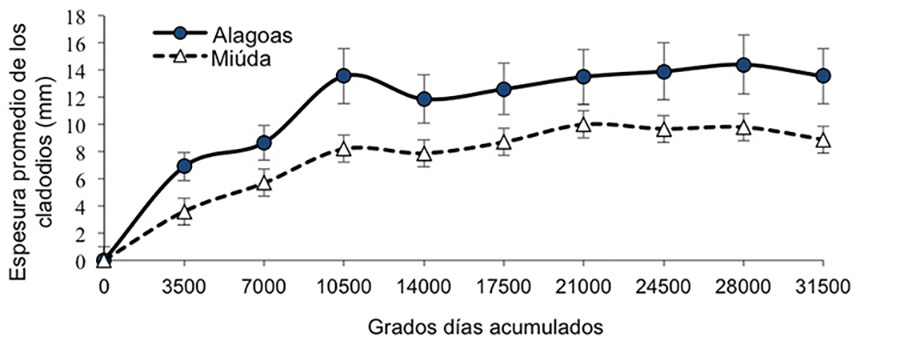 El cultivar Alagoas presentó mayor espesura (p<0,05) de sus cladodios en todos los puntos de evaluación (Figura 4).