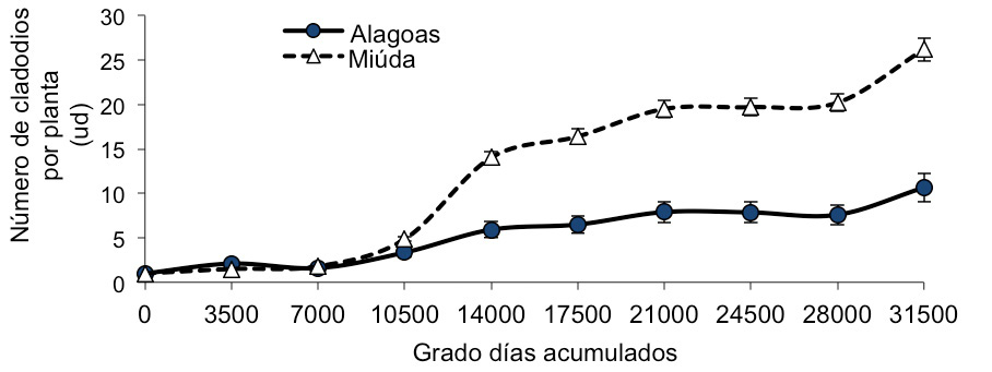 Para el número de cladodios por planta (Figura 5), hubo similar tendencia de crecimiento entre los cultivares hasta los 10500 GDA; sin embargo, el cultivar Miúda tuvo un mayor número de cladodios en todos los puntos de evaluación (p<0,05), a los 31 500 GDA obtuvo cuatro veces más cladodios que el cultivar Alagoas.