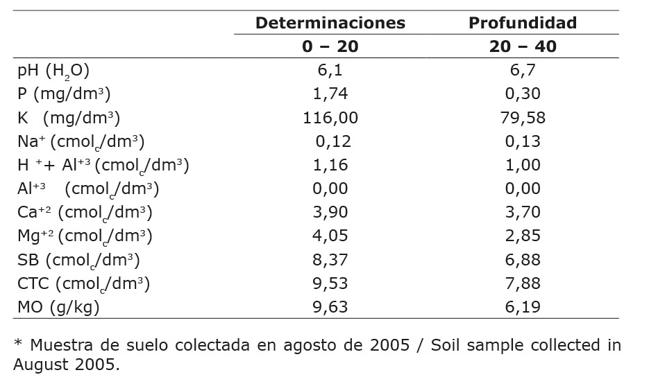 El suelo fue físicamente clasificado como franco-arenoso. En el Cuadro 1 se presentan los resultados del análisis químico del suelo, demostrando en la camada arable, un pH de 6,1, 8,37 cmolc/dm3 para suma de bases, bajo nivel de fósforo (1,74 mg/dm3) y materia orgánica (9,63 g/kg). Cabe señalar que el fósforo es un nutriente limitante para el crecimiento del nopal, niveles más bajos que 5 mg/dm3 pueden retardar el crecimiento en hasta 50% (Nobel, 1989).