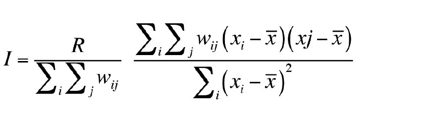 Donde Xi es la variable cuantitativa en el estado i, es su media muestral, wij son los pesos de la matriz W (matriz de pesos espaciales) y R es el tamaño de la muestra (estados). Bajo la hipótesis nula de autocorrelación, el estadístico de Morán es asintóticamente normal.