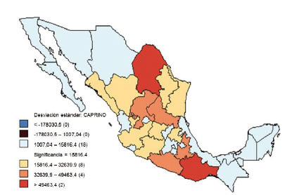 Fuente: estimación propia con OpenGeoDa ver. 0.9.8.14, a partir de datos de la CNOG (2013).En cuanto a la ubicación geográfica, el grupo de la zona norte podría especializarse en la producción de cabrito y cubrir el mercado más importante de este producto que es Monterrey; mientras que, las entidades de la Península, cuya participación en la producción fue casi nula al aportar al año únicamente 0,10% del total, deberían implementar nuevos sistemas productivos y reestructurar los existentes, a fin de impulsar la actividad, y en el futuro integrar las cadenas productivas.