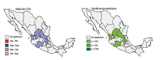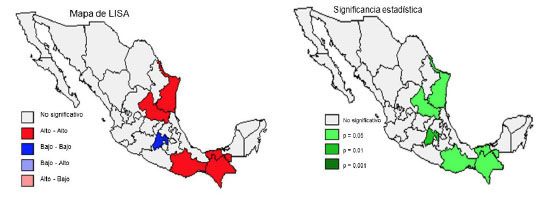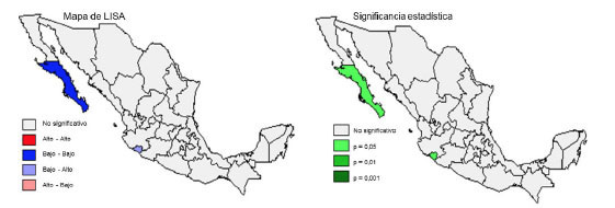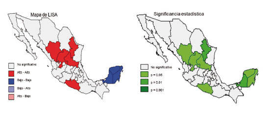 Figure 9. Local Indicators of Spatial Association (LISA test) for pork carcass 2000-2012, Mexico.