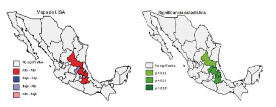 Figure 8. Local Indicators of Spatial Association (LISA test) for cattle carcass 2000-2012, Mexico.