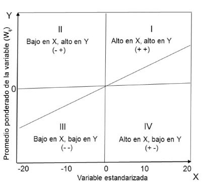 Si los puntos se encuentran en los cuadrantes I y III, el estadístico de Morán tomará un valor positivo, mientras que si los puntos se ubican en los cuadrantes II y IV, el valor será negativo; a partir de esto, la asociación espacial puede ocurrir de la siguiente manera: cuadrante 1, alto en X y alto en Y (+,+); cuadrante II, bajo en X y alto en Y (-,+); cuadrante III, bajo en X y bajo en Y (-,-); y cuadrante IV, alto en X y bajo en Y (+,-) (Figura 1).