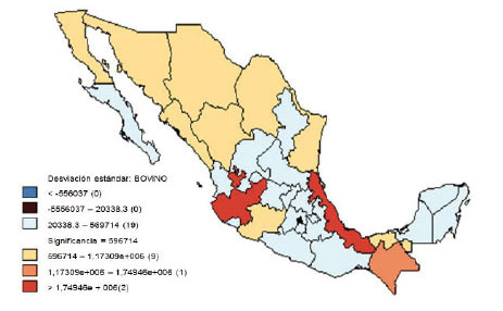 El análisis, se derivó del volumen acumulado de la producción de carne en canal por especie animal, obtenido del reporte de los boletines de información económica pecuaria de la Confederación Nacional de Organizaciones Ganaderas (CNOG, 2013). Las estimaciones se realizaron con el software OpenGeoDa ver. 0.9.8.14.