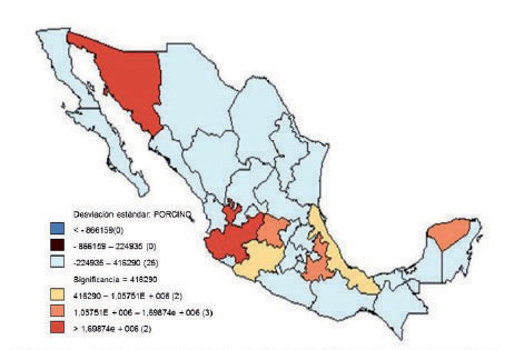 Fuente: elaboración propia con OpenGeoDa ver. 0.9.8.14, a partir de datos de la CNOG (2013).Con relación a la carne de porcino, se encontró evidencia de la fuerte concentración estatal de la producción: Sonora y Jalisco aportaron conjuntamente cerca del 40% de la producción nacional, Guanajuato, Puebla y Yucatán alrededor del 25%; y Veracruz y Michoacán un poco más del 10% (Figura 3). El conglomerado de cerdos articulado con el de granjas productoras de cabezas, con el de alimentos y con el sector agrícola de la región del sur de Sonora, posicionó a esa entidad en primer lugar a nivel nacional, ya que contó con un inventario de 1 572 397 cabezas producidas en 354 granjas, y una infraestructura para el sacrificio equivalente al 20,43% del total nacional.