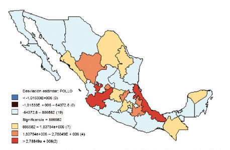 Con significancia del 95%, para el caso carne de pollo, se identificaron estados, que por sus vecinos, podrían conformar un grupo importante de productores que aprovecharán las ventajas de su localización y de economías de escala para fortalecerse, estos fueron Nayarit, Zacatecas, San Luis Potosí, Hidalgo y Michoacán, los cuales obtuvieron conjuntamente 8,37% de la producción (Figura 10).