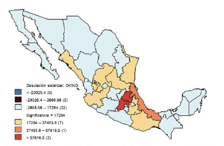 Figure 11. Local Indicators of Spatial Association (LISA Test) for sheep carcass 2000-2012, Mexico.