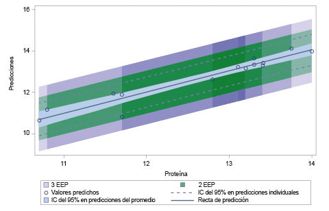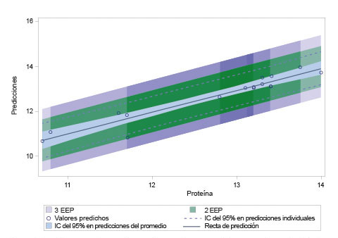 De acuerdo con las Figuras 3 y 4 de los valores observados contra los valores predichos, se observó que ambos modelos de regresión estimaron correctamente los valores del porcentaje de proteína en el conjunto de validación. Todas las observaciones se encontraban dentro de los límites estadísticos; además, la totalidad de las predicciones fueron inferiores al EEP establecido como límite de confianza. Por otra parte, los estadísticos de bondad y de ajuste para el conjunto de validación en la comparación de los métodos por MCP y RCP, constataron que los estadísticos de EEPM, REEPM y EEP presentaron mejores valores con el método de MCP (Cuadro 3). De igual forma, el RDP argumentó a favor del MCP como mejor método de estimación en el conjunto de validación.