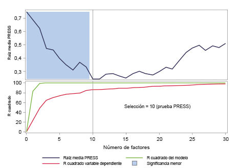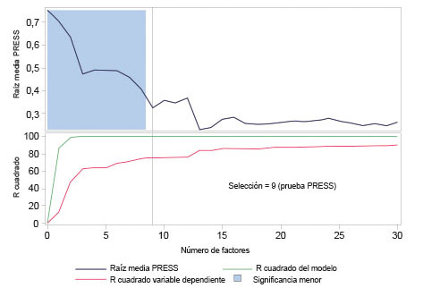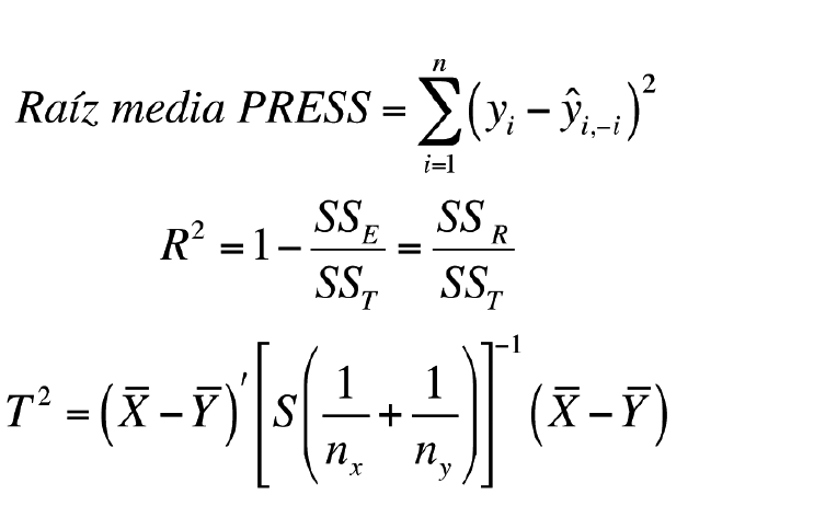 Para la selección del número de componentes, se utilizaron los estadísticos de la raíz media del PRESS, la T de Hotelling y el R2. Estos se definen a continuación (Tenenhaus, 1998):